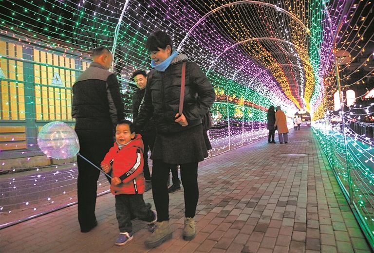 1月15日,西陵一路某商场附近,市民从霓虹灯装饰的“时光隧道”里走过。春节日渐临近,宜昌街头张灯结彩,洋溢着浓浓的节日气氛。(三峡日报全媒记者 黄余洋 摄)