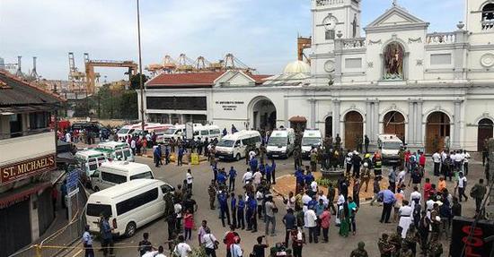 安全人员聚集在发生爆炸的圣安东尼教堂外。图片来源:新华社