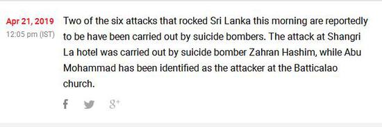 CNN-News18等外媒报道称,目前已确认香格里拉酒店袭击是由自杀式炸弹袭击者扎赫兰·哈希姆(Zahran Hashim)实施,而名为阿布·穆罕默德(Abu Mohammad)的男子对拜蒂克洛教堂进行了炸弹袭击。