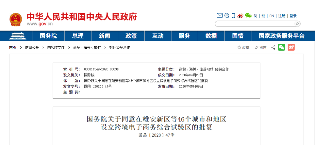 国务院关于同意在雄安新区等46个城市和地区设立跨境电子商务综合试验区的批复