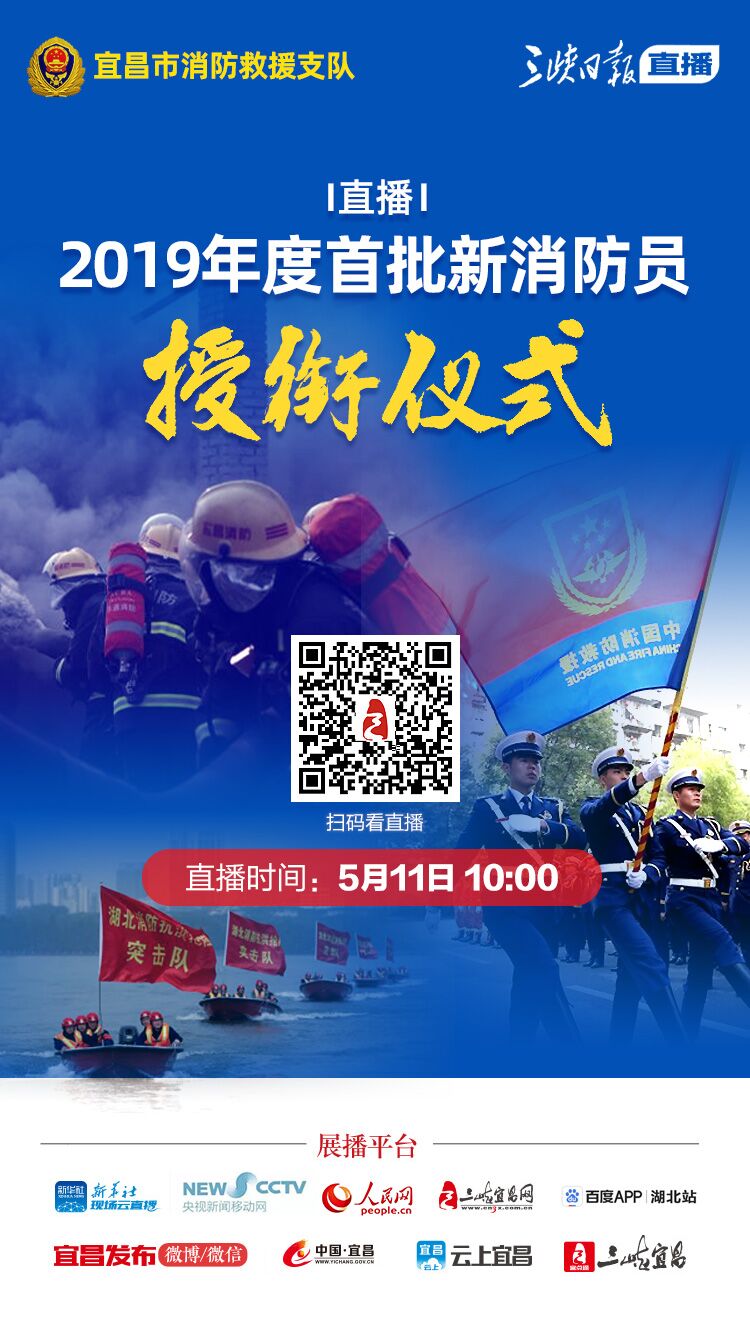 直播预告丨2019年度首批新消防员授衔仪式 2020-05-09 17:17 0 点击图片进入直播链接 直播时间:5月11日上午10:00 地点:宜昌市消防救援支队 直播平台:新华社现场云、央视新闻+、人民网、三峡宜昌网、宜昌市政府网、云上宜昌APP、三峡宜昌(宜点通)APP、宜昌发布微博微信 展现新时代消防队伍形象,激发消防员职业荣誉感,宜昌市消防救援支队将举行2019年度首批新消防员授衔仪式。敬请关注!