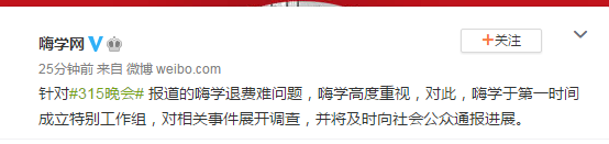 针对3·15晚会报道的嗨学退费难问题,嗨学高度重视,对此,嗨学于第一时间成立特别工作组,对相关事件展开调查,并将及时向社会公众通报进展。