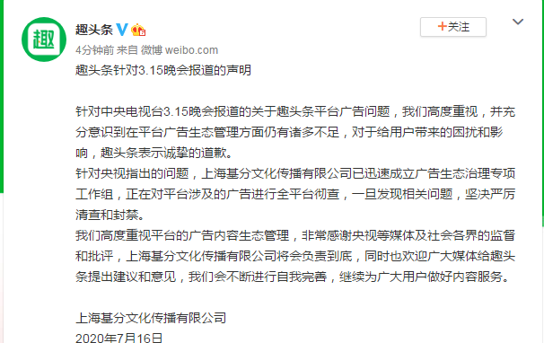针对中央电视台3.15晚会报道的关于趣头条平台广告问题,我们高度重视,并充分意识到在平台广告生态管理方面仍有诸多不足,对于给用户带来的困扰和影响,趣头条表示诚挚的道歉。