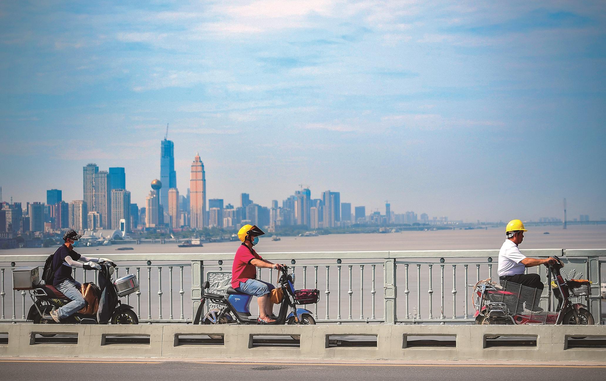 昨日,刚刚结束梅雨季的江城,蓝天如洗,空气清新,令人心旷神怡。图为三位市民骑车经过武汉长江大桥。 楚天都市报记者刘中灿摄