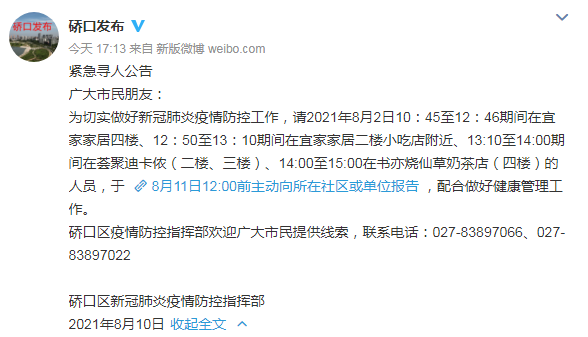 广大市民朋友:为切实做好新冠肺炎疫情防控工作,请2021年8月2日10:45至12:46期间在宜家家居四楼、12:50至13:10期间在宜家家居二楼小吃店附近、13:10至14:00期间在荟聚迪卡侬(二楼、三楼)、14:00至15:00在书亦烧仙草奶茶店(四楼)的人员,于8月11日12:00前主动向所在社区或单位报告 ,配合做好健康管理工作。硚口区疫情防控指挥部欢迎广大市民提供线索,联系电话:027-83897066、027-83897022