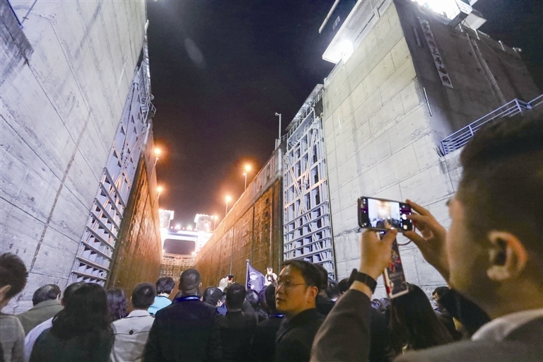 人才嘉宾体验夜色阑珊中葛洲坝船闸“水涨船高”的神奇。三峡日报全媒记者 林潇 摄