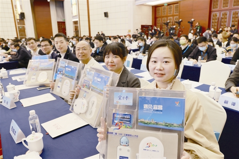 宜昌第二届“330”三峡国际人才日活动开幕式上,青年人才代表收到“宜才卡”大礼包。三峡日报全媒记者 黄翔 摄