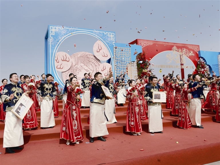 全国70对青年在三峡大坝举行集体婚礼。三峡日报全媒记者 黄翔 摄