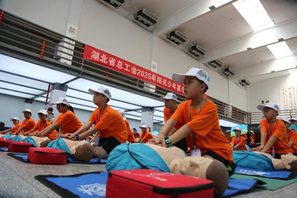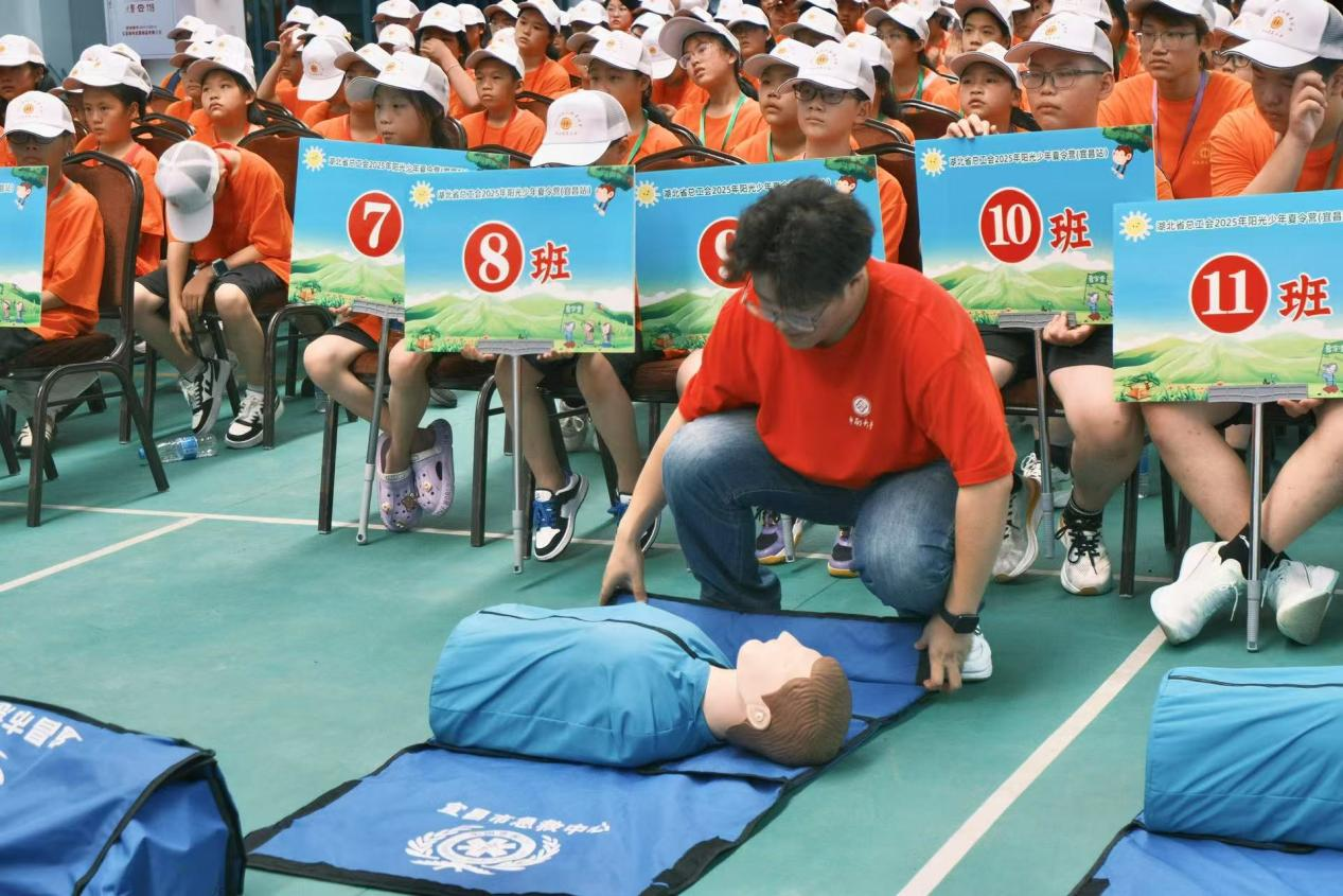 支队成员代表、宜昌市急救中心实习生侯启卓助力宜昌市急救中心培训导师周敬梅,为全体营员进行急救知识科普及实操课。理论讲授、情景模拟和现场实操相结合,重点强化防溺水应急处置能力,系统性开展呼吸道清理、人工呼吸、心肺复苏及AED设备操作等标准化实训,为职工子女筑牢生命安全青春防线。凡星火闪耀处,皆是生命守护的灯塔!