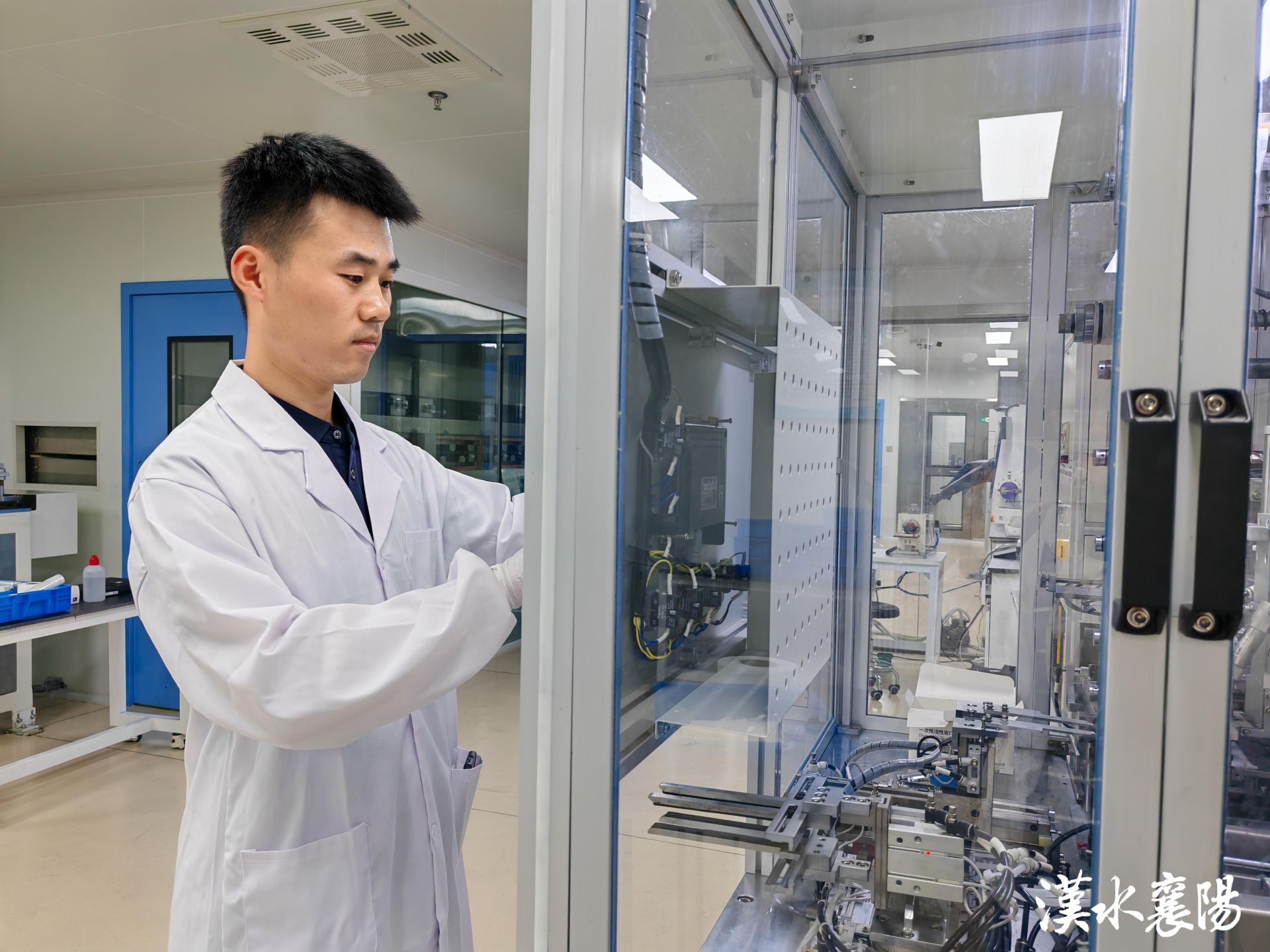 ▲武汉理工大学博士,隆中实验室软包电池中试线负责人李士栋正在做实验