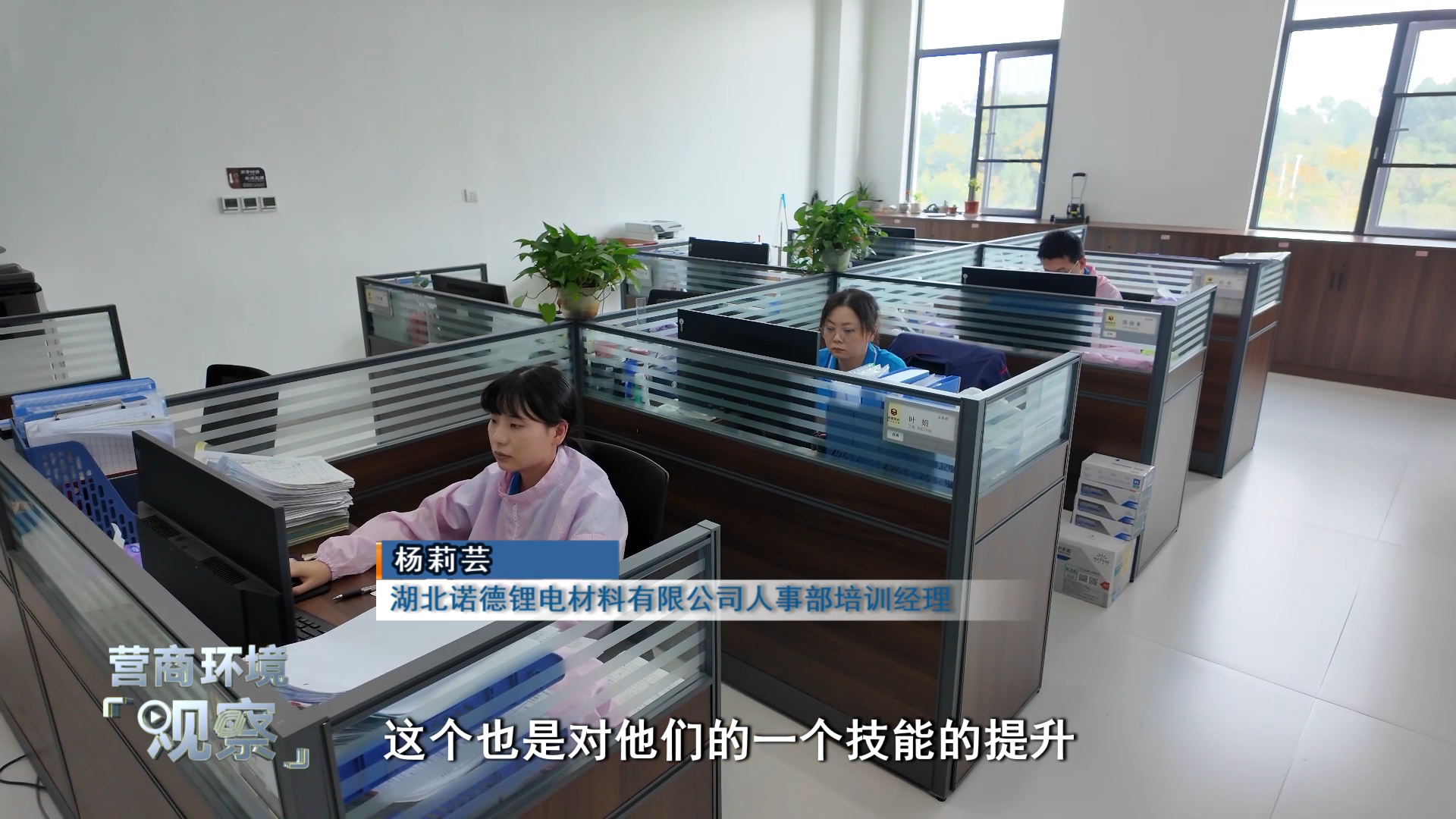湖北诺德锂电材料有限公司人事部培训经理 杨莉芸:最近也入职了湖比工程职业学院,还有湖北理工学院和其他院校的一些学生,都有来到我们公司进行一个实习,这个也是对他们的一个技能的提升,也是对我们后续员工人才培养的发展有一定的帮助。二厂马上就要开了,对招工大量的缺口也是起到了一定的帮助,让我们也缓解了一些压力,对我们目前黄石的营商环境还是比较满意的。