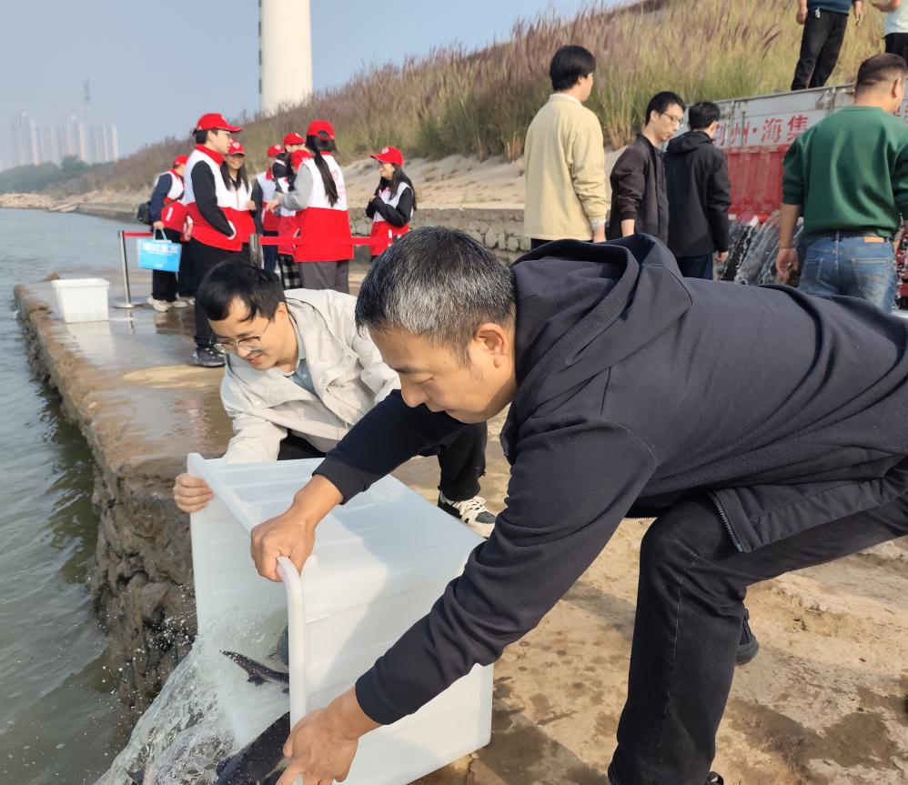 放流现场,志愿者们分组协作,将一箱箱盛放着中华鲟的转运箱平稳地抬到江边,小心翼翼地沿着亲水平台将一尾尾珍贵的中华鲟放归长江。大家用实际行动,共同助力长江水生生物多样性保护。