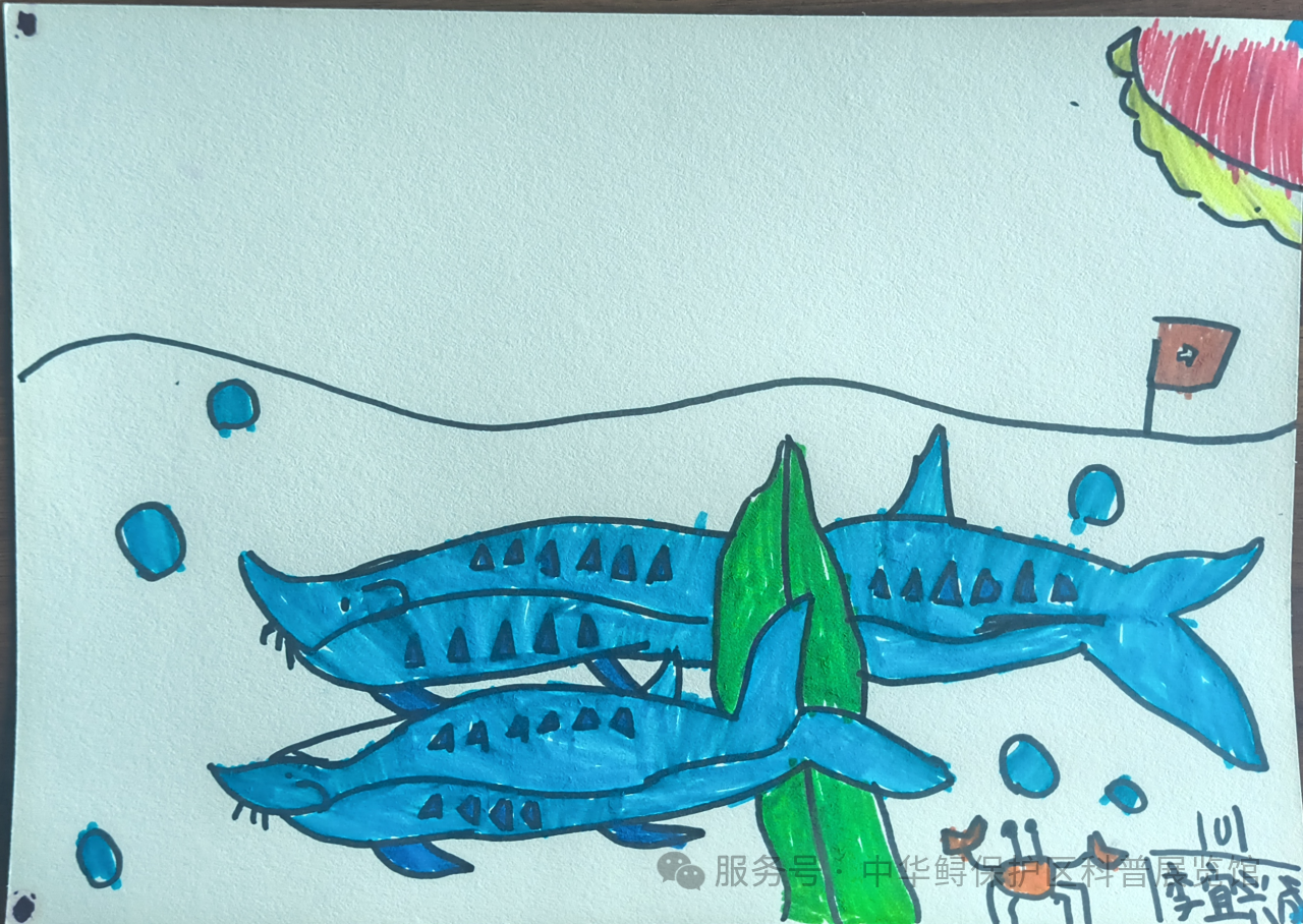孩子们铺开画纸的瞬间,水彩笔在纸上游走,发出沙沙的轻响。小朋友们都是灵魂画手,有的画中华鲟吐着彩虹泡泡,旁边飘着“长江大保护”五个歪扭的字;有的添上一丛丛绿绿的水草,更有孩子将“禁止捕捞”警示牌画成守护神盾。“这是江豚的标志,下面是一双大手,我们要一直保护它!”王娅楠小朋友开心地分享她的画作。这些色彩斑斓的作品,诉说着新一代的生态承诺。(中华鲟保护区科普展览馆)