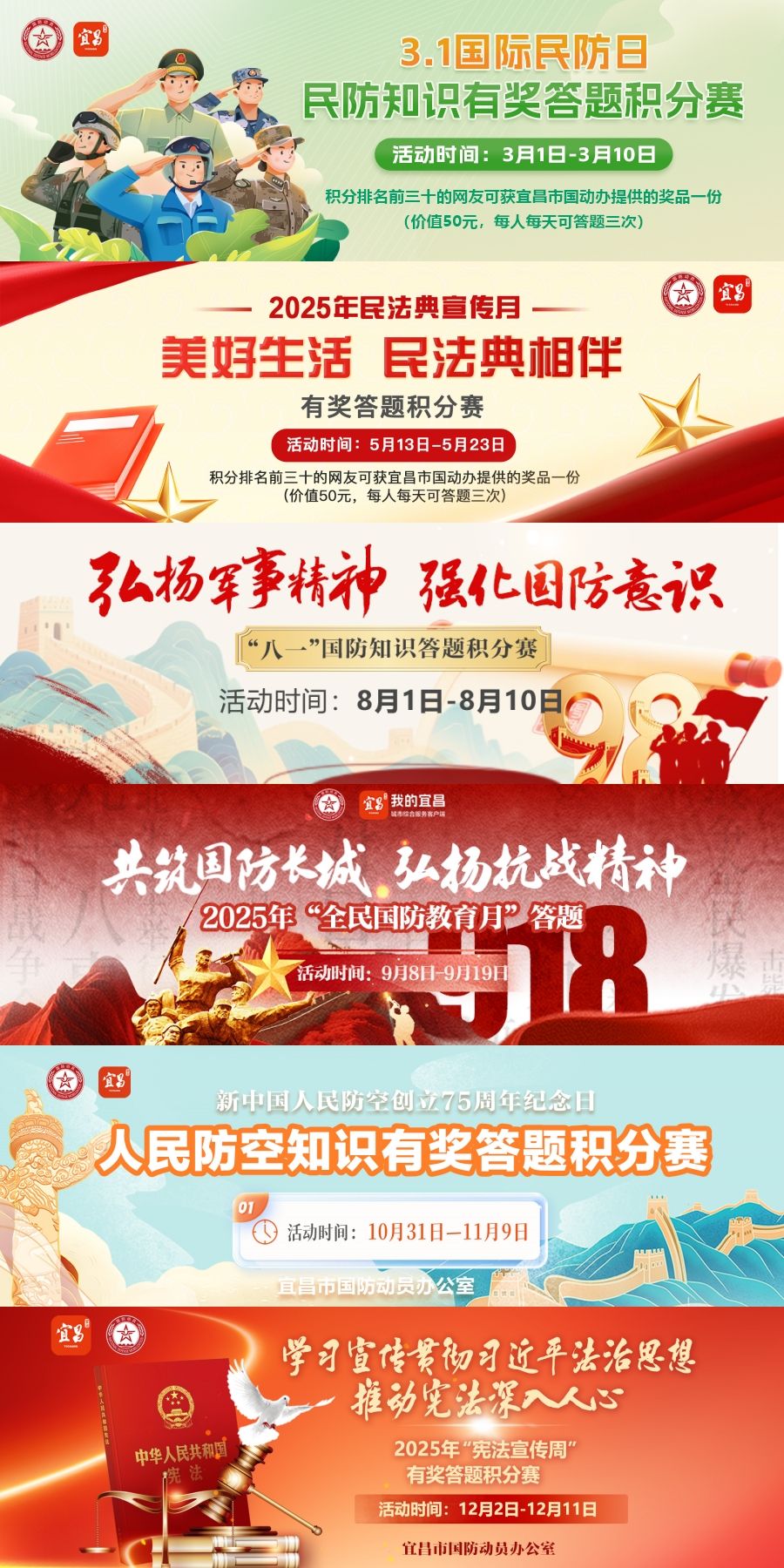 为打破传统普法宣传的单一模式,增强宣传的趣味性和参与度,宜昌市国防动员办公室精心策划系列互动式普法活动。其中,普法灯谜活动以国防法律法规、国防动员知识等为核心内容,让市民在猜谜解谜的过程中潜移默化学习国防知识;6次互动答题活动则聚焦国防安全、国防义务、国防动员相关政策等内容,在全年重要节点:3月1日国际民防日、5月12日全国防灾减灾日、8月1日建军节、9月全民国防教育月(9·18)、10月31日新中国人民防空创立日、12月4日国家宪法日举办线上答题有奖积分赛,进一步加深群众对国防法治知识的理解与记忆。