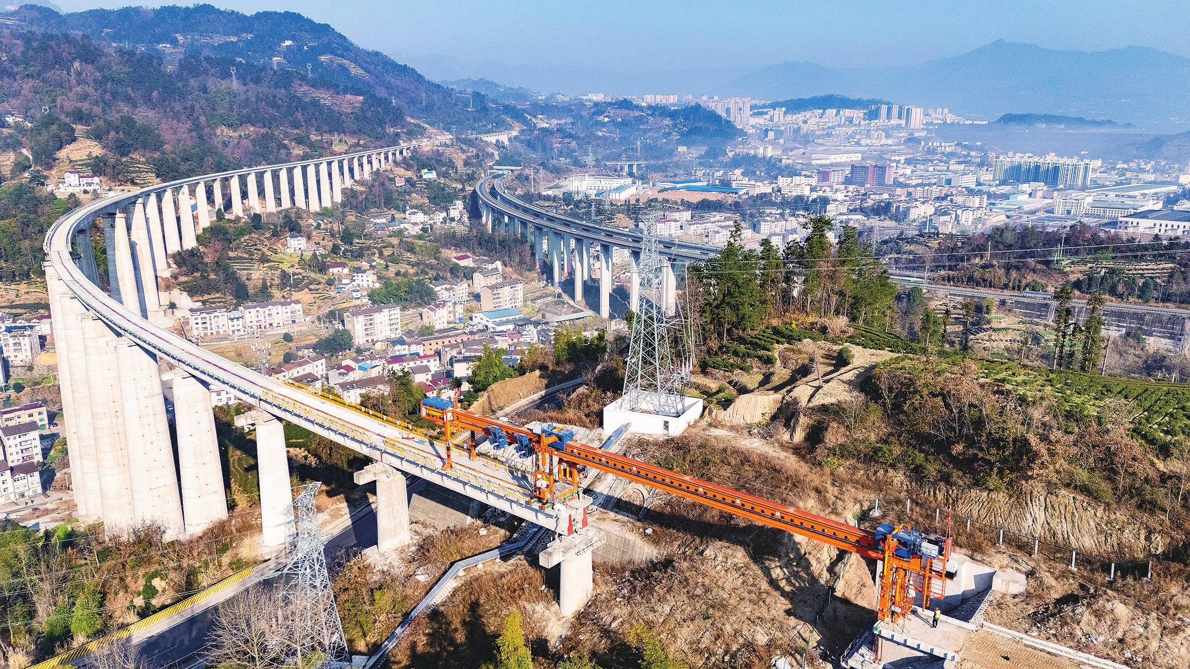 1月7日,三峡枢纽茅坪港疏港铁路九里特大桥正在架设最后一节T型梁架。三峡枢纽茅坪港疏港铁路自宜万铁路宜昌南站西端引出,止于秭归县茅坪港,线路全长39.59公里,按国铁Ⅲ级铁路标准建设。该铁路建成后,将与三峡翻坝江南高速公路、三峡翻坝江北高速公路一起,共同构建长江三峡水路、公路、铁路的“多式联运”交通运输体系。(通讯员彭强 摄)
