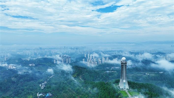 “城市绿肺”展生态画卷 2025-09-20 11:27 三峡日报 0 9月16日清晨,西陵区窑湾黑虎山顶上的宜昌气象风云塔笼罩在云雾之中。远处城市轮廓在流动的雾霭间若隐若现,塔身巍然耸立,与周边绿意交织成一幅生态与城市相融的画卷。“城市绿肺”在云雾衬托下,展现出自然与都市和谐共生的独特魅力。(记者林潇 摄)
