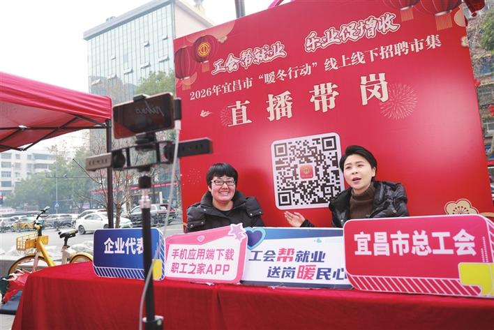 当日,宜昌市“暖冬行动”招聘会在宜昌城区星光天地广场举办。现场以“线上+线下”联动模式开展系列就业服务,精准对接企业用工与重点群体就业需求,助力新春稳就业“开门红”。据了解,1月至3月,全市计划开展线上线下招聘会214场,把政策咨询、职业指导、岗位匹配的一站式服务送到群众家门口。