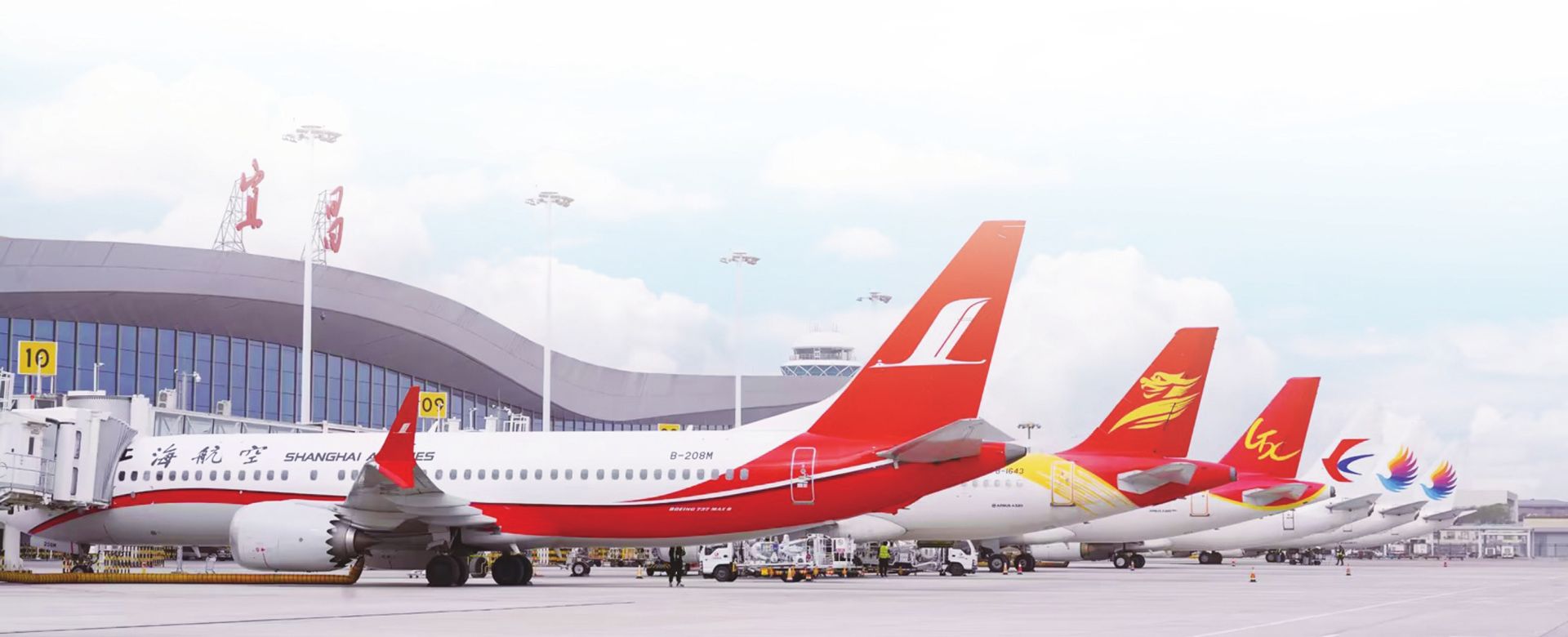 一架架客机整齐地静卧在停机坪上。 本组图片由宜昌三峡国际机场 提供