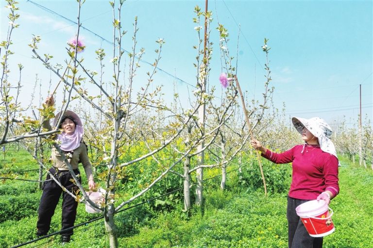 3月31日,枝江市百里洲万亩梨花竞相绽放,果农们抢抓有利时节,忙着为梨花进行人工授粉,提升坐果率与果品品质。