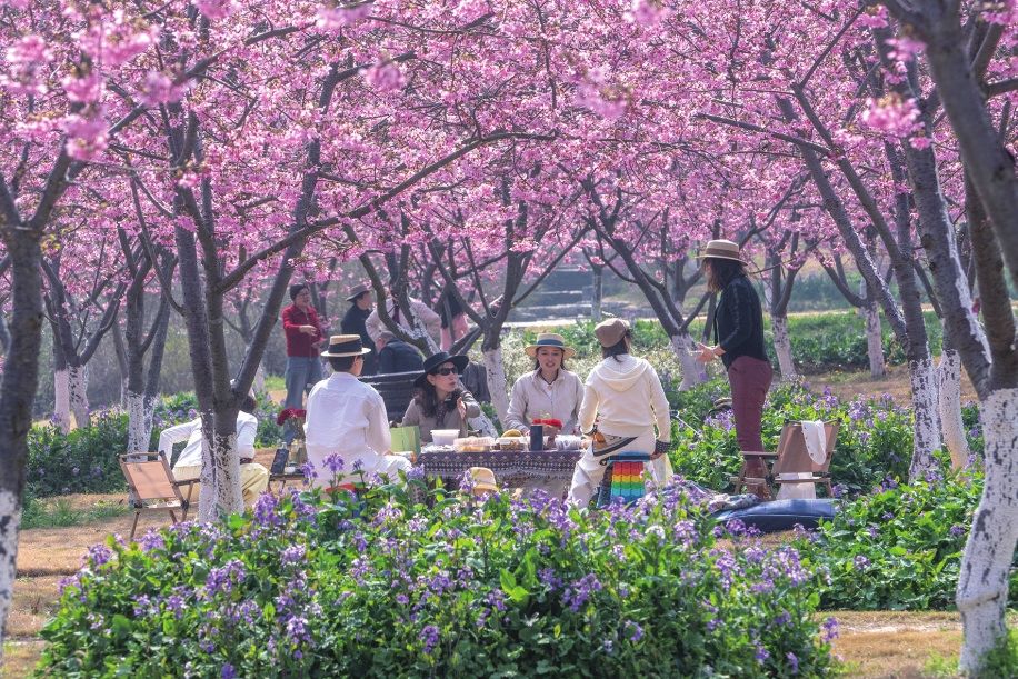 枝江市同心花海繁花盛放,游客们围坐野餐,尽享春日惬意。 (记者付蓓蓓、通讯员李博 摄)