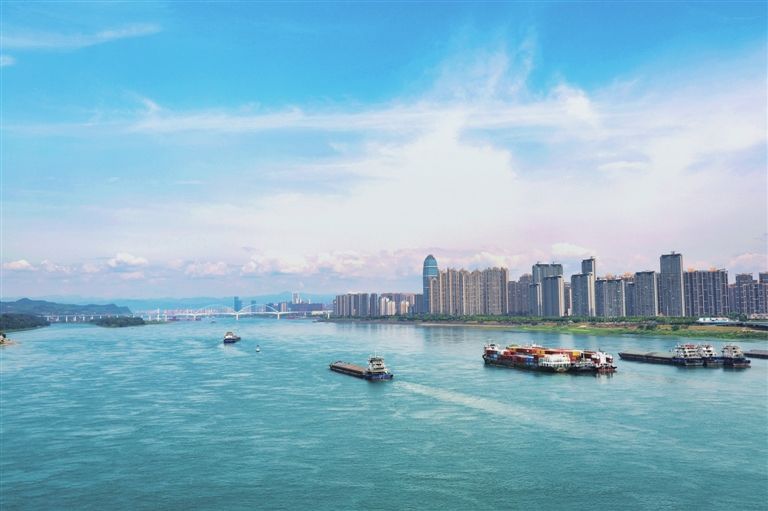 4月23日,宜昌长江岸线水清岸绿、船行江中,宛如一幅美丽的生态画卷。 三峡日报记者 黄翔 摄