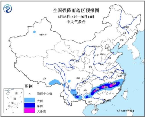 据中央气象台消息,中央气象台今日10时继续发布暴雨橙色预警:预计,6月25日14时至26日14时,湖南中南部、江西中部、福建北部、浙江南部、广西北部和西部、云南东部等地有大到暴雨,其中,湖南西南部和东部、江西中部、福建西北部、广西北部等地局地有大暴雨(100~200毫米);上述部分地区有短时强降水、局地伴有雷暴大风等强对流天气,最大小时雨强30~60毫米,局地可超过70毫米。