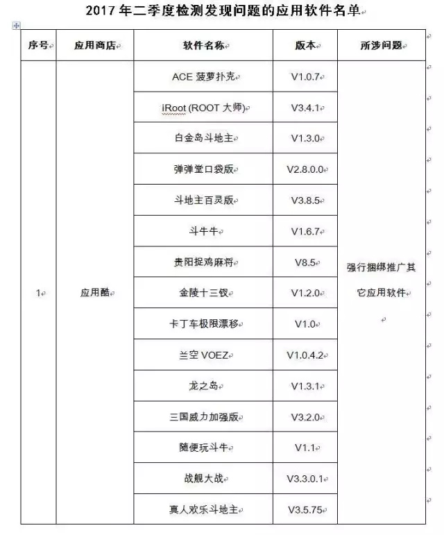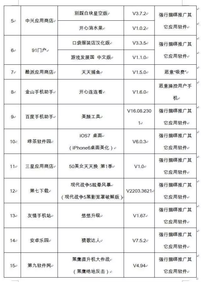 工信部公布二季度手机APP“黑名单” 你安装了吗? 2017-08-01 14:52 0 二季度,工业和信息化部组织对55家手机应用商店的应用软件进行技术检测,发现违规软件42款,涉及违规收集使用用户个人信息、恶意“吸费”、强行捆绑推广其他应用软件等问题,已责令下架。 (工信部网站)