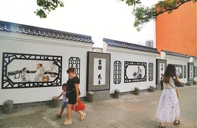 8月8日,市民从市中医院旁文化墙前走过。一组以绘画形式描绘的中医药文化墙在城区沿江大道中医院旁亮相,美化了城市环境。(三峡日报 记者 岳黎 摄)