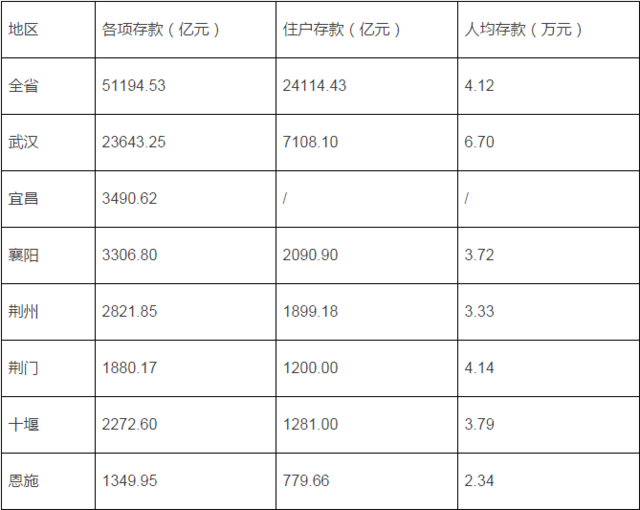 统计部门发布的数据显示,截至2017年6月末,湖北全省各项存款余额达到51194.53亿元,其中与居民个人储蓄最相关的住户存款余额达到24114.43亿元,比年初增加2047.96亿元,相当于每个湖北人存款4.12万元。