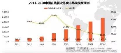 iiMedia Research(艾媒咨询)数据显示,中国在线餐饮外卖市场自2011年一直保持较高速增长,但整体市场正趋于稳定。2017年,外卖市场整体交易额预计突破2000亿元,与打车并列成为O2O行业交易规模最大的两个领域。
