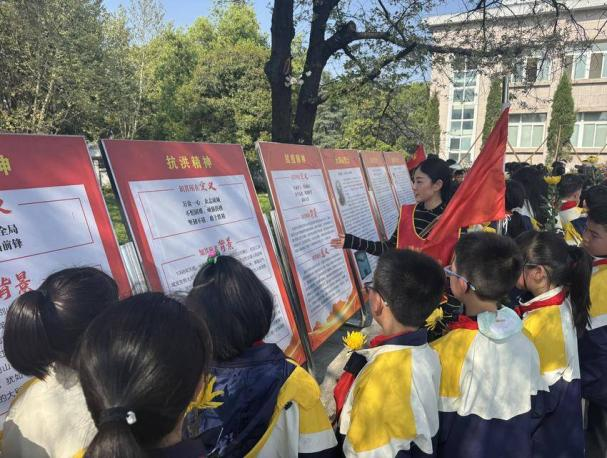 下午时分,烈士陵园庄严肃穆。全体人员整齐列队,在革命烈士纪念碑前高唱国歌,向英烈默哀致敬。党员教师代表敬献花篮。随后,全体党员重温入党誓词,少先队员重温入队誓词,铿锵的誓言表达了赓续红色血脉的坚定信念。祭扫仪式后,党员教师化身“红色精神志愿宣讲员”,分组为少先队员们讲述“三大精神”(长征精神、抗战精神、延安精神)和抗洪故事。党员志愿者们结合英烈事迹,用鲜活的故事将红色精神娓娓道来,为孩子们上了一堂生动的“移动思政课”。这种“大手拉小手”的互动形式,让红色教育入脑入心。